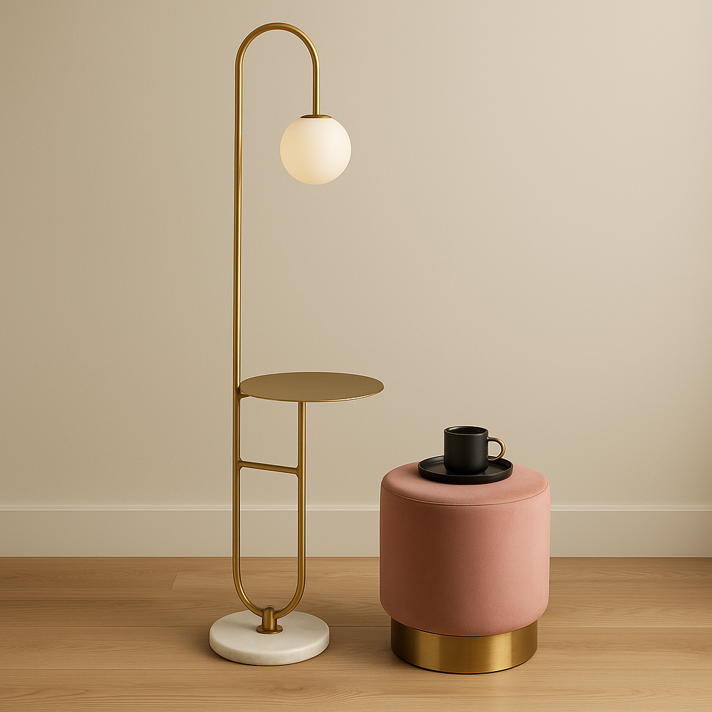 ARCO GOLD es una sofisticada lámpara de piso con mesa auxiliar integrada, diseñada para combinar elegancia y funcionalidad en un solo elemento decorativo. Con una altura de 152 cm y un diámetro de mesa de 32 cm, este modelo destaca por su estructura en dorado mate, base de mármol blanco y pantalla esférica de vidrio opalino. Ideal para espacios modernos como salas de estar, rincones de lectura o dormitorios con estilo. ARCO GOLD eleva la estética del ambiente mientras proporciona iluminación cálida y superficie útil.