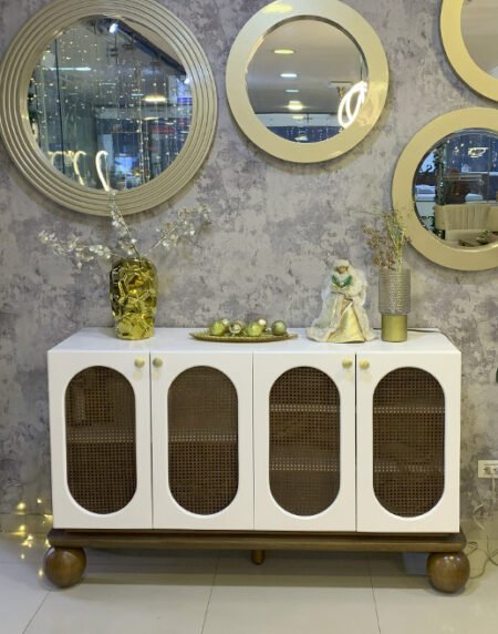 El BIFFET BOREAL redefine tu espacio con su diseño personalizable en blanco o wengué, puertas en mimbre natural y patas esféricas. Estilo, funcionalidad y calidad en tu hogar.